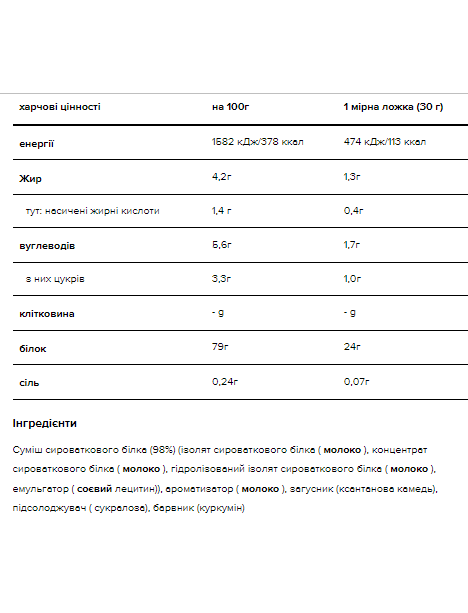 Сироватка 100% Gold Standard від Optimum Nutrition, відома своєю якістю, виборола шанувальників по всьому світу. Його формула включає суміш сироваткових білків (ізолят, концентрат та гідролізований ізолят сироваткового білка), всього 24 г білка (включаючи 5,5 г BCAA), 1,1 г жиру та 1,2 г цукру на дозу. Білок сприяє підтримці чи збільшенню м'язової маси. Продукт доступний у кількох уподобаннях для гурманів, включаючи Cookies & Cream. Після тренування або протягом дня приймайте 1 мірну ложку Gold Standard 100% Whey, змішану з 200-250 мл води. Щоб збільшити вміст білків, жирів та вуглеводів та отримати більш гладку текстуру, змішайте з молоком.