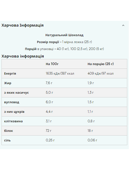 Розмір порції - 1 мірна ложка (25 гр) Порцій в упаковці - 40 (1 кг), 100 (2.5 кг), 200 (5 кг) Харчова цінність У 100 гр У порції *RI Калорійність 1740 кДж/412 ккал 435 кДж ккал 5% Жир 7.5 гр 1.9 гр 3% з яких насиченого 5.0 гр 1.3 гр 6% Вуглеводи 4.0 гр 1.0 гр 0.5% з яких цукру 4.0 гр 1.0 гр 1% Протеїн 82 гр 21 гр 4 Рекомендована норма споживання середнього дорослого (8400 кДж/2000 ккал) Інформація дана для версії без смаку, в інших варіантах значення можуть відрізнятися до 15%