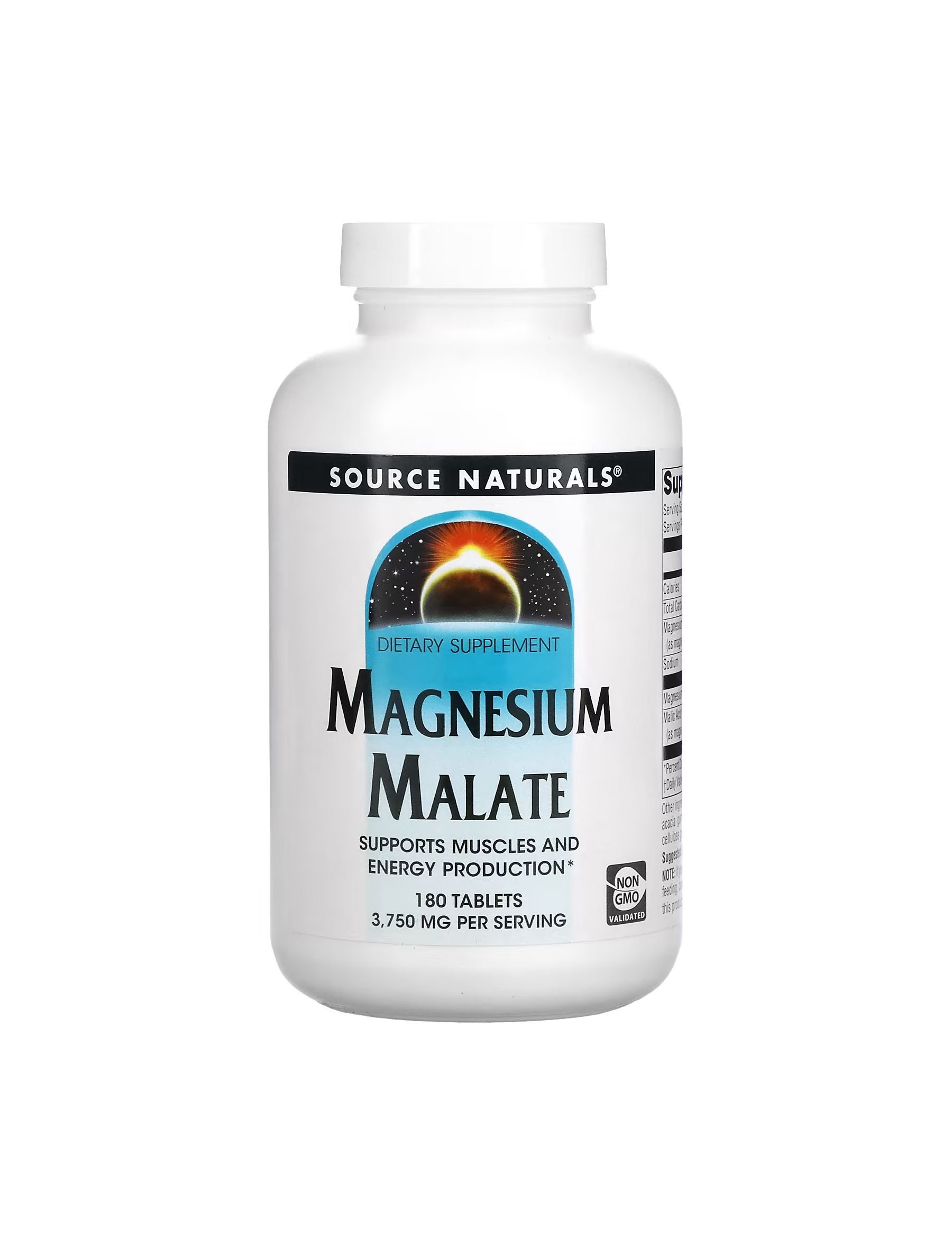 Малат магнію від Source Naturals — це комплекс магнію і яблучної кислоти. Він підтримує функцію м’язів, здоров’я серцево-судинної системи і сприяє виробленню енергії. Яблучна кислота — натуральна фруктова кислота, що міститься в більшості клітин організму і бере участь у циклі Кребса, у якому енергія зберігається під час метаболізму вуглеводів і жирів. Магній — кофактор, необхідний для більш ніж 300 ферментних реакцій метаболізму, синтезу АТФ і вироблення енергії. Магній відіграє важливу роль у розслабленні м’язів через його функції кофактора для ферментів і завдяки здатності врівноважувати кальцій у клітині.