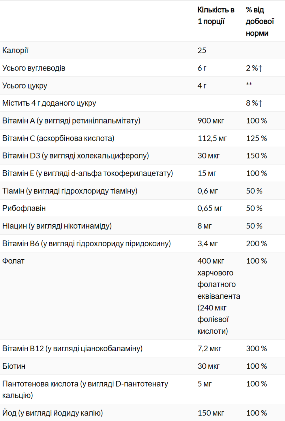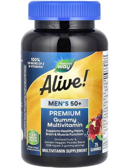 - ‡ Містить більше тіаміну (0,6 мг замість 0,3 мг), рибофлавіну (0,65 мг замість 0,35 мг), ніацину (8 мг замість 4 мг), ніж жувальні таблетки для чоловіків старше 50 років Alive!® не преміальної якості.