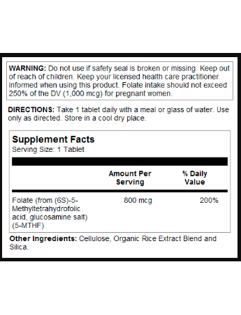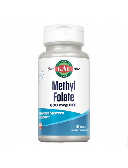 Інформація про продукт. Метилфолат від KAL містить (6S)-5-Метилтетрагідрофолат (5-MTHF). Фолієва кислота призначена для забезпечення поживної підтримки нормального здорового синтезу ДНК, метаболізму гомоцистеїну та роботи серцево-судинної системи. Жінка, яка дотримується здорового харчування та має достатню кількість фолату в організмі, може знизити ризик народження дитини з вродженим дефектом головного або спинного мозку. Для вагітних жінок споживання фолату не повинно перевищувати 250 % від добової норми (1000 мкг).