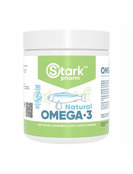 Харчова добавка Stark Pharm - Stark Natural Omega 3 містить рибний жир натуральний. Добавка є джерелом поліненасичених жирних кислот з філе різних сортів риби з максимально можливим для отримання натурального (без застосування хімічної обробки) вмістом ЕПК і ДГК у формі тригліцеридів. Омега - група ненасичених жирних кислот, в яку входять поліненасичені жирні кислоти, з яких ейкозапентаєнова (EPA) і докозагексаєнова (DHA) кислоти, є незамінними (не відтворюються в організмі в необхідному обсязі, а при їх нестачі виникають різноманітні біохімічні і фізіологічні порушення).