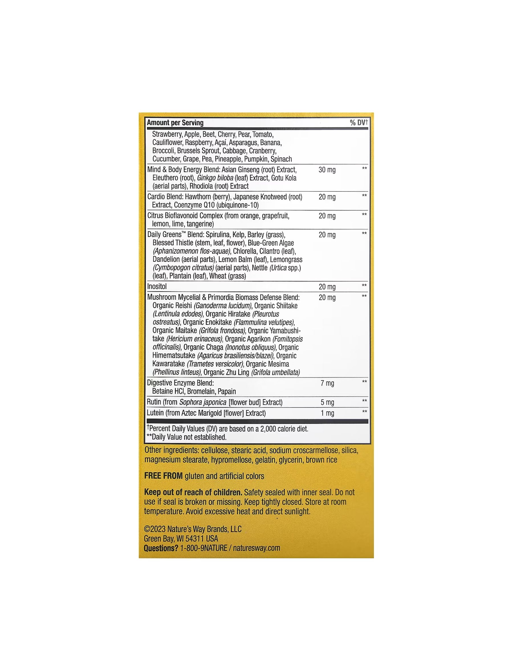 Целюлоза, стеаринова кислота, кроскармелоза натрію, діоксид кремнію, гіпромелоза, стеарат магнію, желатин, гліцерин, коричневий рис.