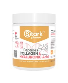 Штрихкод: 4829888052064 Харчова добавка Stark Pharm - Stark Collagen Peptides & Hyaluronic Acid - це комплекс, який містить колаген і гіалуронову кислоту в якості основи, доповнений рядом вітамінів. Склад добавки сприяє нормалізації роботи опорно-рухового апарату, є додатковим джерелом колагену...