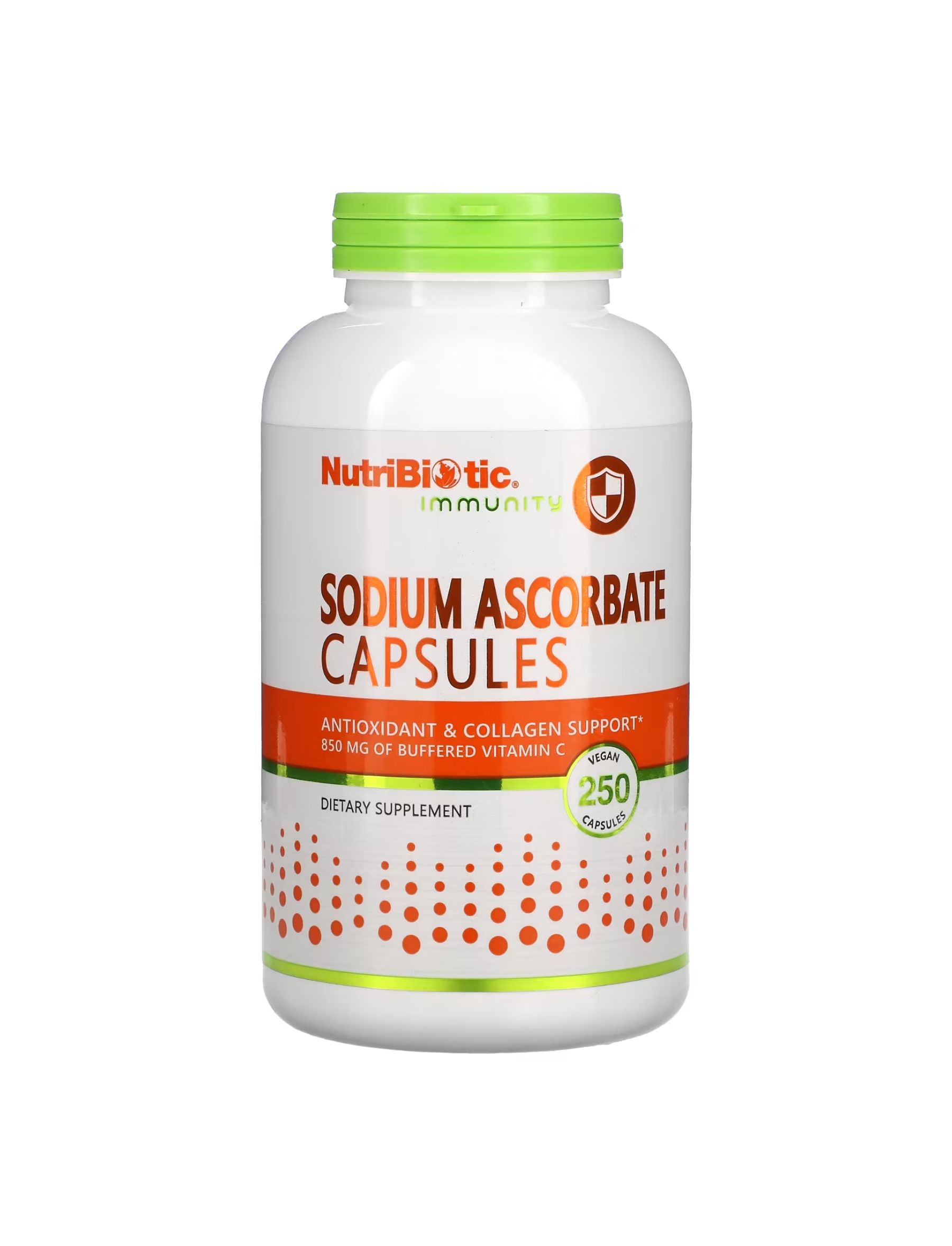 Аскорбат натрію NutriBiotic виробляється шляхом розчинення L-аскорбінової кислоти в природному гідрокарбонаті натрію. Натрій у цьому продукті відрізняється від звичайних кухонних солей, оскільки він не поєднується з хлором. Аскорбат натрію NutriBiotic в капсулах ідеально підходить для людей, яким потрібна лужна (буферізована) форма вітаміну С.