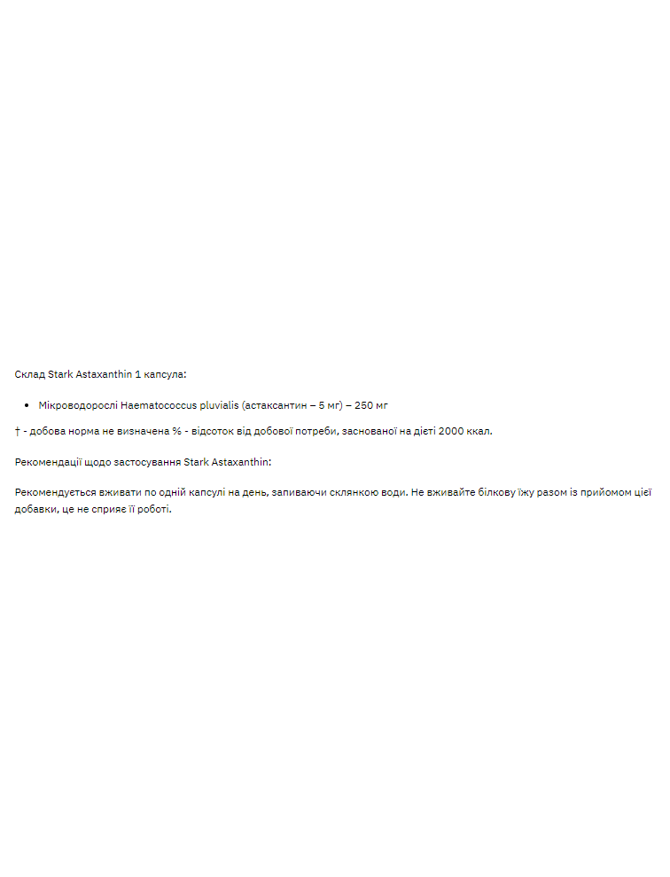 Stark Astaxanthin є невід'ємною добавкою як для людини, яка веде активний спосіб життя, так і для професійних спортсменів. Крім виведення токсинів з організму антиоксидант Stark Astaxanthin має низку позитивних властивостей: