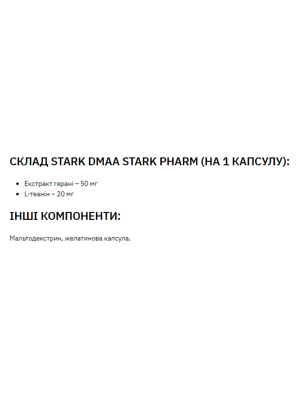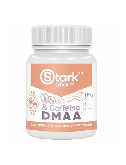 Stark DMAA & Caffeine Stark Pharm – у зручній формі, капсулах, що підвищує працездатність, стійкість та витривалість, як фізичну, так і розумову. Діюча речовина - екстракт герані, разом з кофеїном, не має значних негативних побічних ефектів, у порівнянні з використанням одного кофеїну для такого ж результату. Поряд з іншими препаратами подібного впливу варто відзначити, що саме DMAA є найефективнішим з точки зору обивателів тренажерних залів.