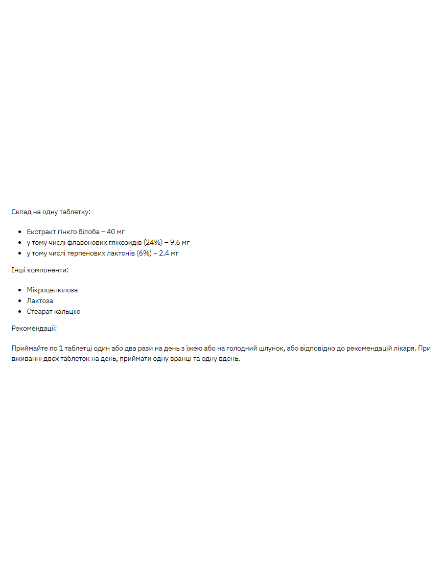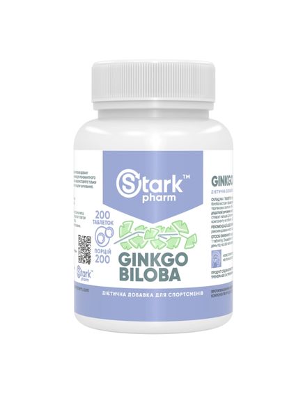 Ноотроп, антиоксидант Stark Ginkgo Biloba Extract Це високоякісний стандартизований екстракт концентрованого гінкго білоба містить щонайменше 24% флавонових глікозидів та 6% терпенових лактонів. Показання для застосування, клінічна дія Stark Ginkgo Biloba Extract: жвавість розуму (підтримує кровообіг у головному мозку); покращує розумову функцію та пам'ять; використовую при лікуванні запаморочення, жезорієнтації; підтримка літнього організму (антиоксидантні властивості). Склад на одну таблетку: Ginkgo biloba extract – 40 мг флавонових глікозидів (flavone glycosides) 19,2 мг терпенових лактонів (terpene lactones) 4 мг