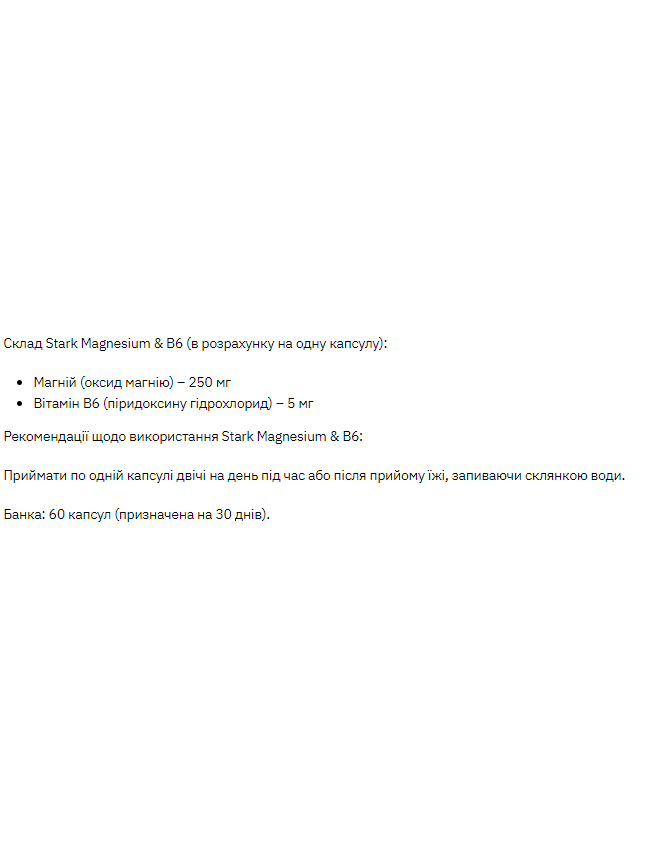 Stark Magnesium & B6 рекомендується до вживання як додаткове джерело магнію та вітаміну B6.