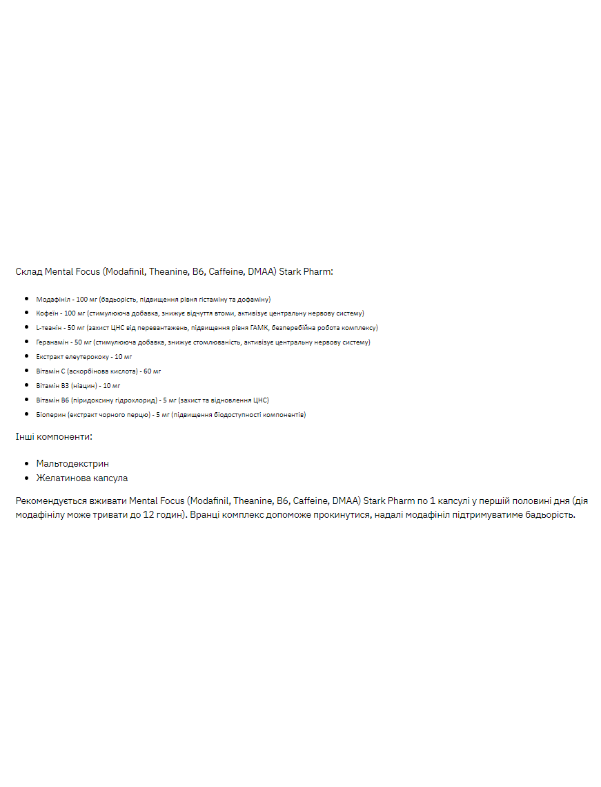 Склад Mental Focus (Modafinil, Theanine, B6, Caffeine, DMAA) Stark Pharm: