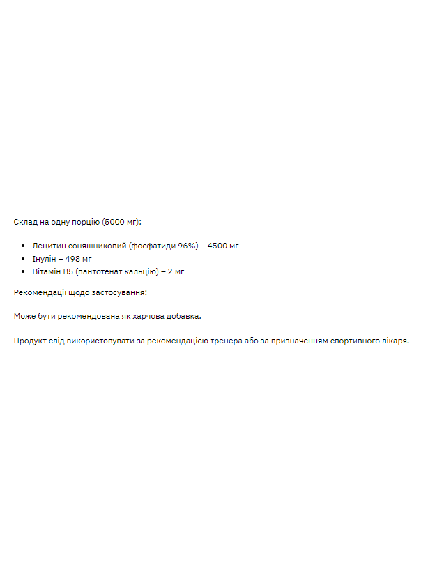 лецитин соняшниковий (фосфатиди 96%) – 4500 мг, інулін – 498 мг;