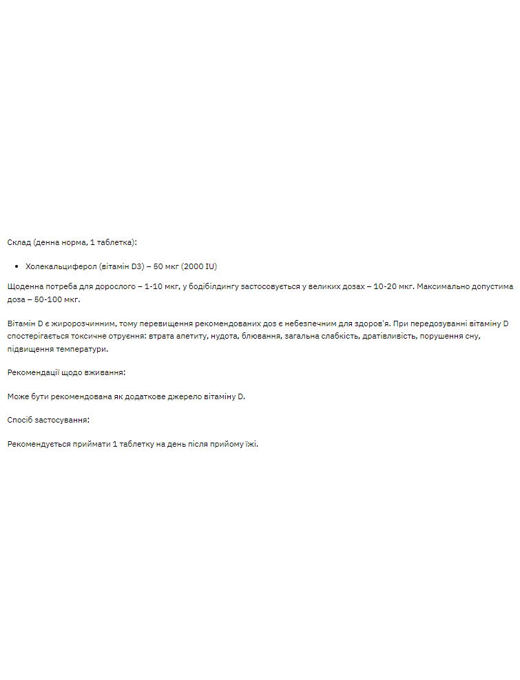 Це добавка вітаміну D3 із концентрацією 2000 IU (50 мкг) на одну таблетку.