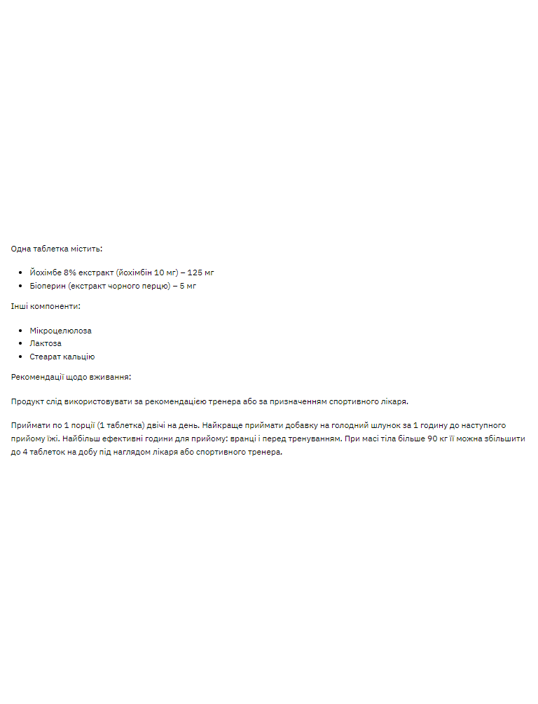 Йохімбе 8% екстракт (йохімбін 10 мг) – 125 мг