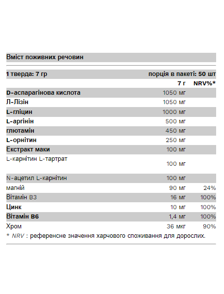 Інгредієнти: мальтодекстрин, D-аспарагінова кислота, L-лізин гідрохлорид, L-гліцин, регулятор кислотності (лимонна кислота), L-аргінін гідрохлорид, L-глутамін, ароматизатор (вишня / манго), L-орнітин гідрохлорид, оксид магнію, підсолоджувачі (Ацесульфам K, сукралоза), екстракт кореня Lepidium meyenii 10:1, L-карнітин L-тартрат, N-ацетил L-карнітин, ніацин, оксид цинку, колір (poncho 4R), піридоксину гідрохлорид, хрому піколінат.