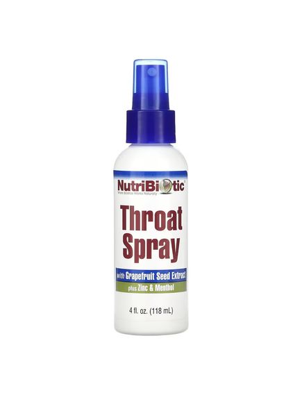 Спрей для горла NutriBiotic з цитрицидом (екстракт насіння грейпфрута), цинком та ментолом сприяє зміцненню здоров’я ротової порожнини та горла.
