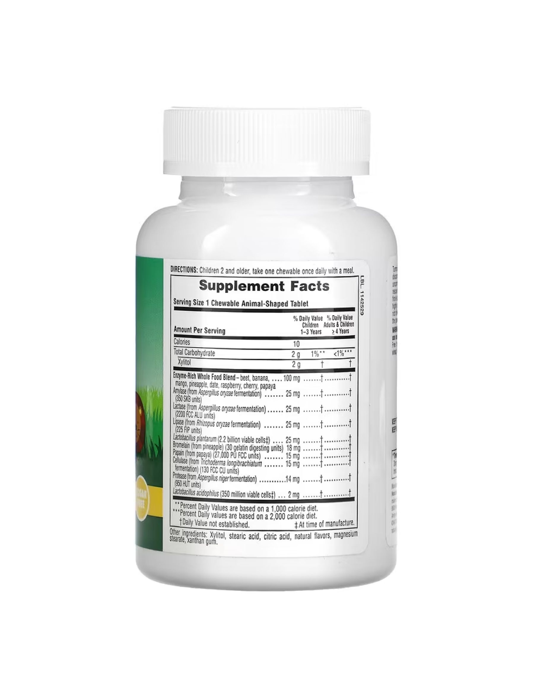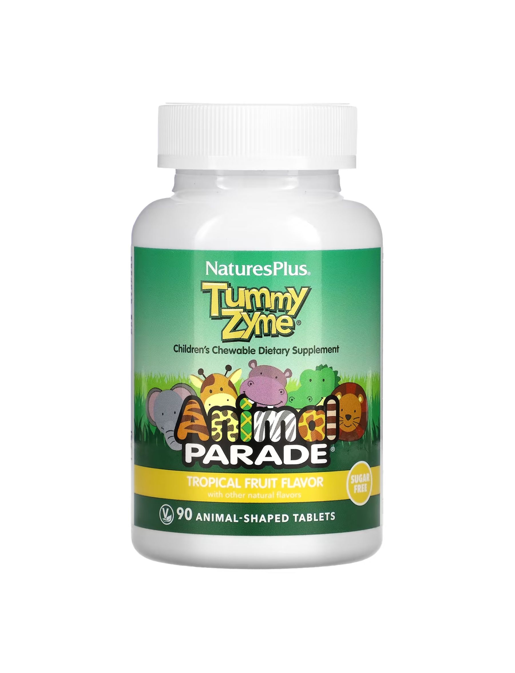 Дитячі жувальні цукерки Tummy Zyme® Animal Parade® — це повноцінна натуральна ферментна добавка для підтримки травлення, яку люблять діти. Кожна кумедна жувальна цукерка у формі тварини, що має чудовий смак тропічних фруктів, містить високоактивні харчові ферменти, які допомагають перетравлювати та вивільняти білки, вуглеводи й жири. Ці потужні, але м’яко діючі на шлунок травні ферменти допомагають забезпечити надходження корисних поживних речовин з харчових продуктів у зростаючий дитячий організм, покращуючи здоров’я та травлення. Tummy Zyme Animal Parade підтримує здорове травлення багатою ферментами сумішшю цільних продуктів і живих пробіотиків.