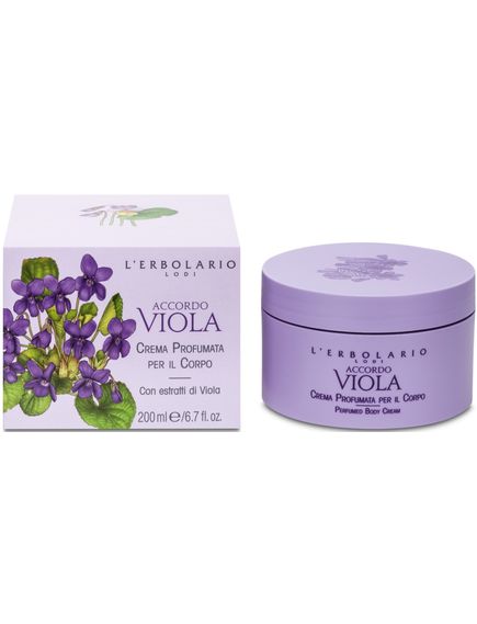 Цей ароматний і пишний крем піклується про шкіру тіла, розподіляючи всю ефективність своїх функціональних речовин. На мові квітів віола символізує романтичне кохання: екстракти братків і фіалки пахучої зі справжньою любов’ю присвячують всю свою антиоксидантну силу епідермісу, захищаючи його від передчасного старіння. Крім того, є три благородні олії, бавовна, бабассу та олива, які забезпечують пом’якшувальну, живильну дію та відновлюють шкірне сало, щоб уникнути повстяності та в’ялості шкіри.