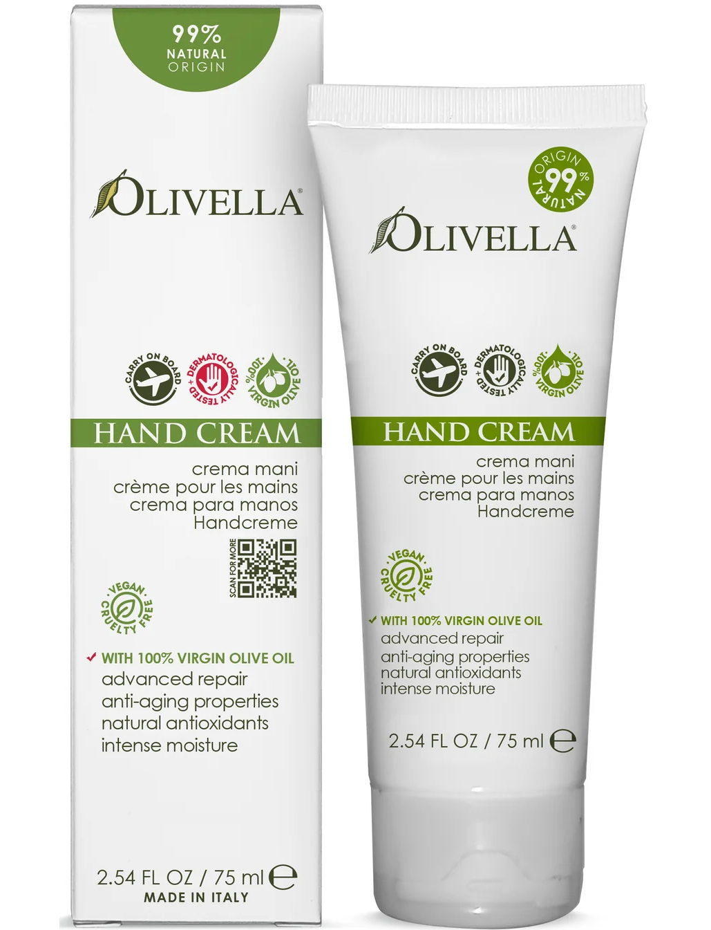 Крем для рук Olivella® має натуральне рослинне походження, має блискучий вигляд і легкий аромат. Делікатний для догляду за руками, покращує зволоження шкіри, роблячи шкіру м’якою, без відчуття жирності та захищаючи її від агресивного впливу зовнішніх факторів. Багатий поживними речовинами, він поглинається, проникаючи в найглибші шари дерми, щоб відновити водний баланс і надати еластичність і м'якість. Його емульсія на основі чистої оливкової олії першого віджиму разом із вмістом вітаміну F запобігає сухості та тьмяному вигляду шкіри.
