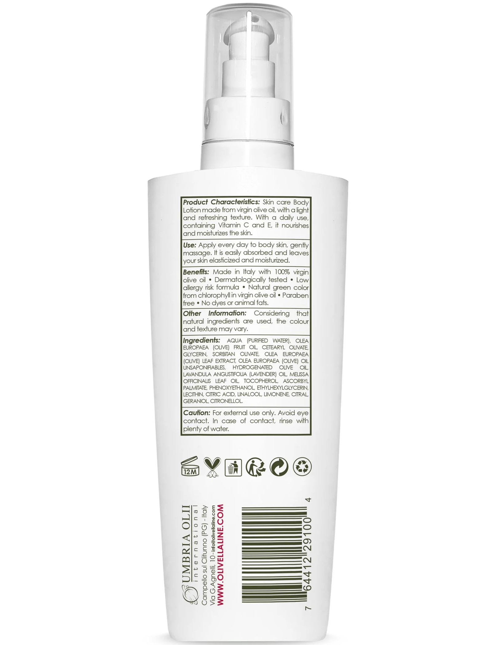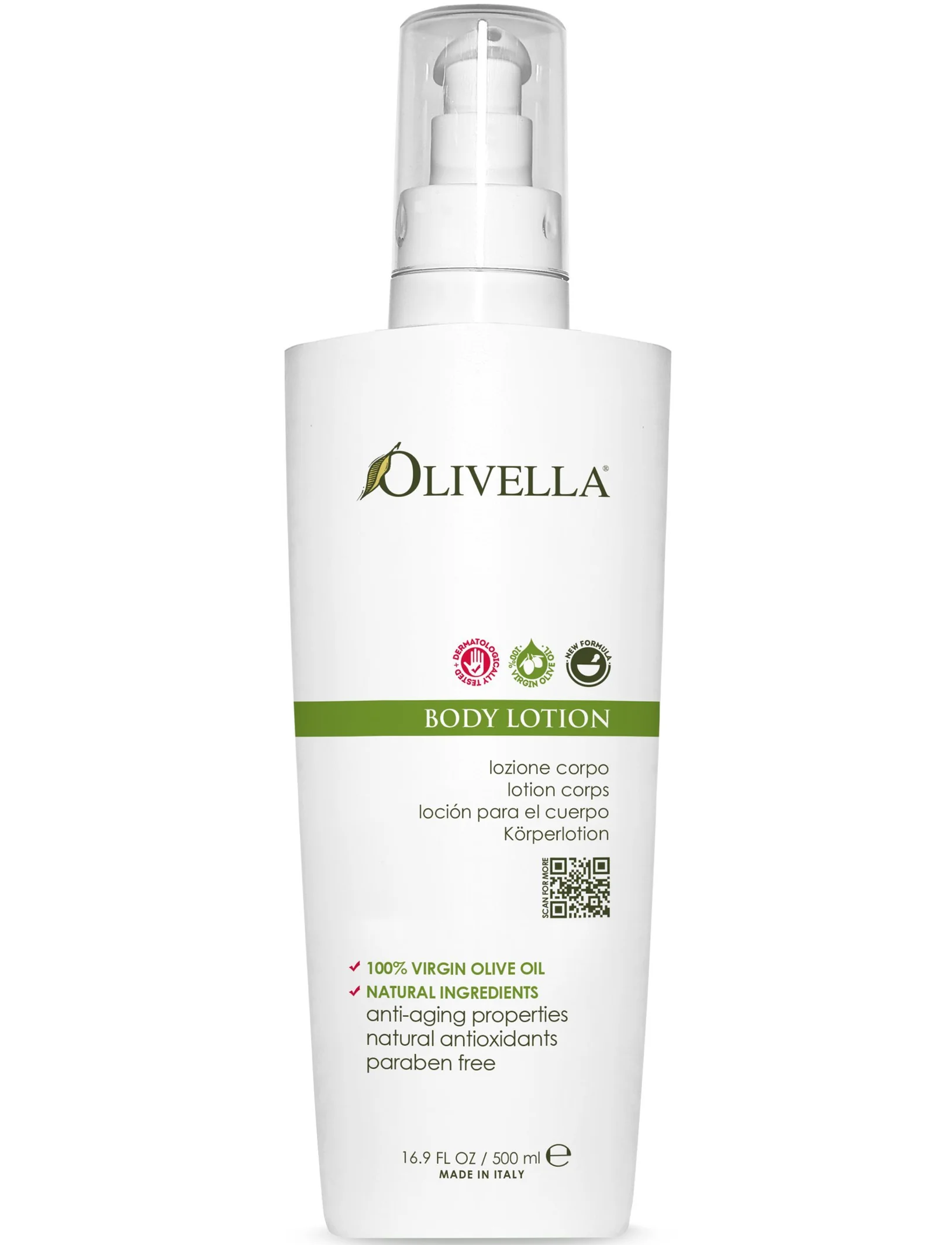 Лосьйон для тіла OLIVELLA спеціально зроблений в зручній пляшці обсягом 500мл, щоб Ви змогли вдосталь насолодитися чарівною дією оливкової олії в поєднанні зі свіжим ненав'язливим рослинним ароматом Меліси! Завдяки надзвичайно легкій текстурі лосьйон для тіла OLIVELLA просто незамінний для догляду за тілом в теплу пору року, адже він легко всмоктується, не залишаючи липкості і жирності на тілі. Зроблений на основі 100% оливкової олії з Італії, лосьйон містить вітаміни А, С і Е, які допомагають відновити еластичність і пружність шкіри при регулярному застосуванні. Оливкова олія ефективно зволожує і живить шкіру, усуваючи сухість і лущення.