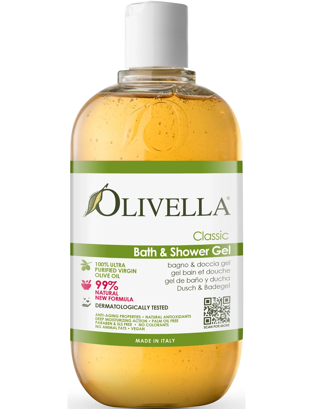 Гель для ванни та душа OLIVELLA надзвичайно ніжно очищає шкіру, залишаючи при цьому її м'якою і ніжною. Інноваційний продукт і запатентована технологія не руйнують захисний епідермальний шар шкіри, а насичують її вітамінами-антиоксидантами оливкової олії. Формула гелю для ванни і душу OLIVELLA містить в основі нейтральне мило, виготовлене з 100% оливкової олії Virgin без застосування хімічних процесів, згубних для стероловой фракції і жирних кислот, що містяться в ньому, без барвників і консервантів. Тому гель для душу OLIVELLA ідеально підходить для частого використання для всіх членів сім'ї для будь-якого типу шкіри! Спробуйте гель, який не сушить шкіру, зберігаючи її природну гладкість.
