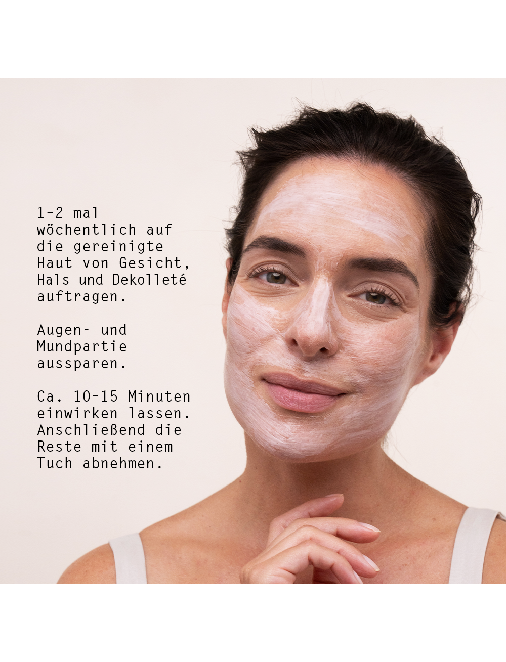 Після очищення нанесіть на обличчя, шию та зону декольте, уникаючи області навколо рота та очей. Через максимум 7 хвилин видаліть залишки маски серветкою. Ніжно помасажуйте.