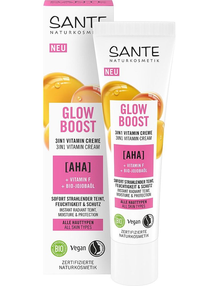 Вітамінний крем Glow Boost від Sante забезпечує тривале зволоження та догляд. День за днем шкіра захищена від сухості та впливу навколишнього середовища, що миттєво призводить до свіжого та сяючого кольору обличчя.