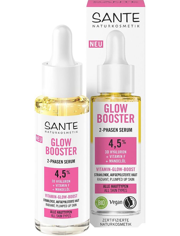 Двофазна сироватка Glow Booster від SANTE Naturkosmetik на 100% веганська та не містить інгредієнтів тваринного походження. Відкрийте для себе секрет природного сяйва та побалуйте свою шкіру потужною формулою догляду від SANTE Naturkosmetik!