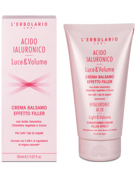 Кондиціонер із приємною кремоподібною консистенцією, який має дивовижний ефект наповнювача з першого застосування: волосся відразу виглядає більш рівним, насиченим і об’ємним завдяки надзвичайній дії гіалуронової кислоти. Крім того, рослинний кератин підвищує стійкість і еластичність, а дистилят м'якоті кокоса відновлює м'якість.