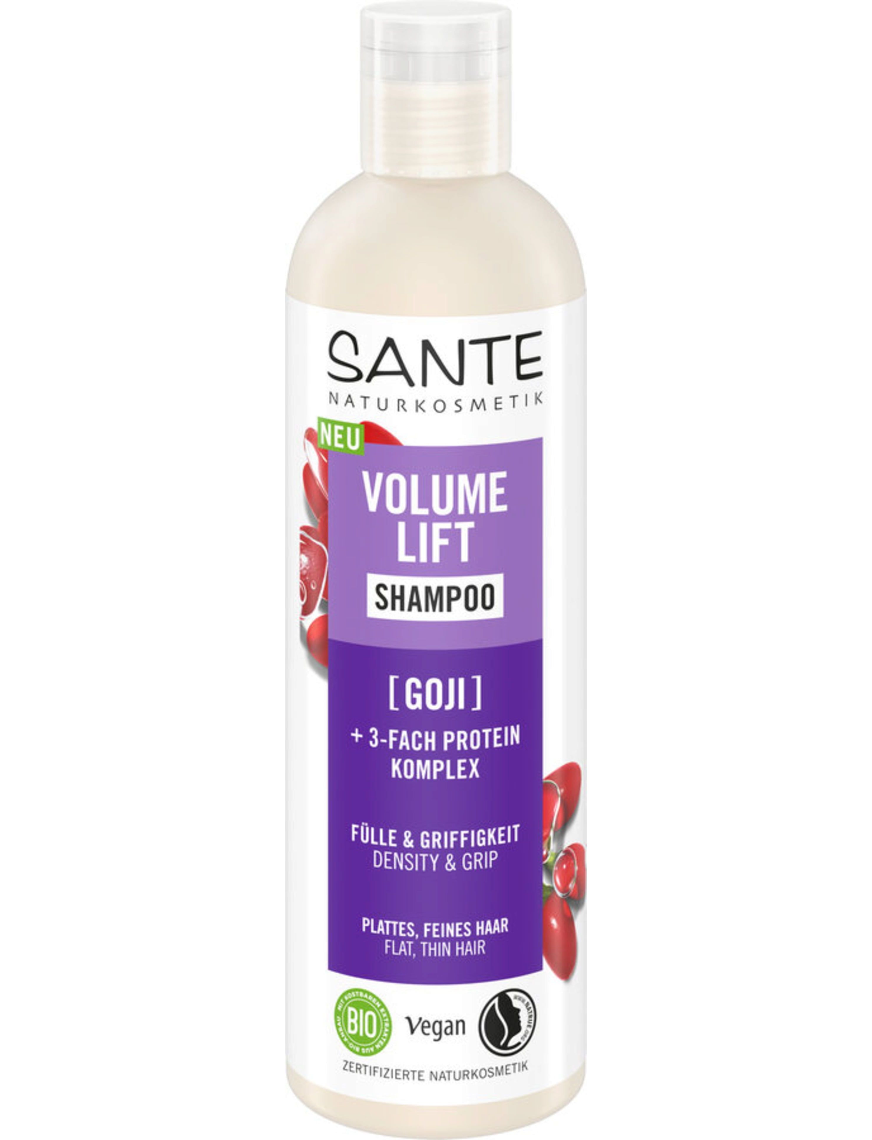 Шампунь Volume Lift від SANTE вдихає свіже повітря в тонке волосся та забезпечує цінну вологу. Формула з потрійного протеїнового комплексу та органічного екстракту ягід годжі створює структуру волосся зсередини, надаючи інтенсивний об’єм і забезпечує додаткову пружність.