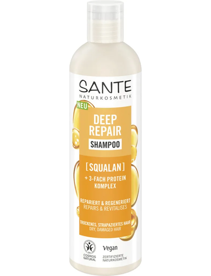 Відновлюючий шампунь SANTE NATURKOSMETIK серії Deep Repair має потужну лікувальну формулу, спеціально розроблену для сухого та пошкодженого волосся, до складу якої входить сквалан і триступеневий протеїновий комплекс. Ця формула помітно відновлює структуру волосся вже після першого використання. Сквалан склеює кератинові лусочки волосся, живить волосяні цибулини, повертаючи природне сяйво та гладкість, а також пом'якшує шкірний покрив голови. Потрійний протеїновий комплекс, проникаючи у структуру волосся у місця з втраченим білком, заповнює ці прогалини, лікуючи пошкоджені ділянки по всій довжині. Арганова олія насичує волосся вологою зсередини і запобігає її втраті, забезпечуючи захист від негативних зовнішніх факторів. Аргінін покращує кровообіг шкіри голови, чим cприяє загальному оздоровленню волосяного покриву. Оливкова олія робить волосся гладким і шовковистим, покращуючи його еластичність і міцність. Алое позитивно впливає на шкіру голови, запобігаючи появі лупи.