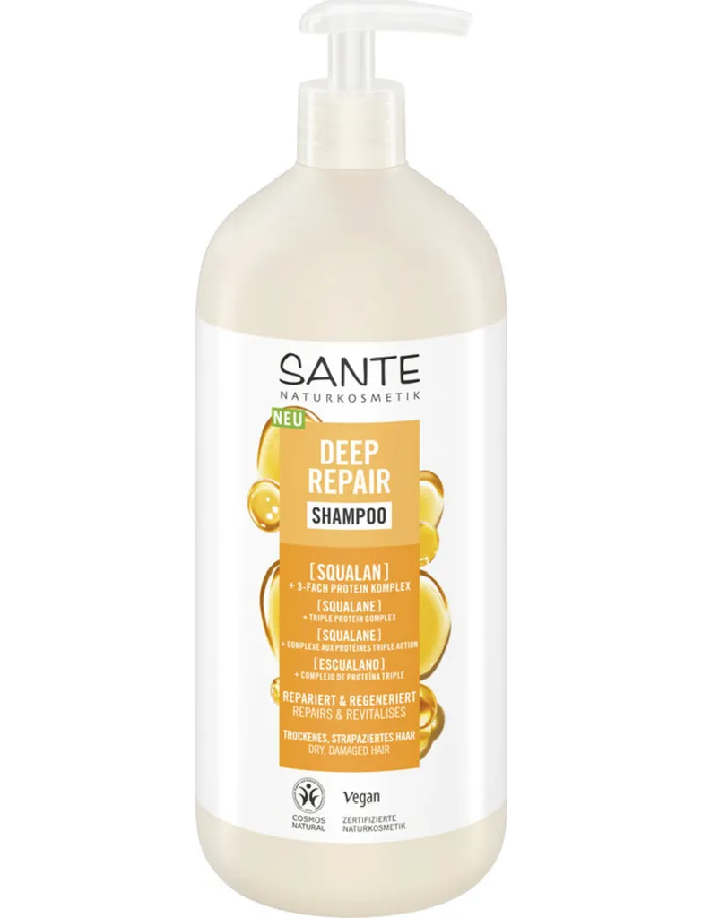 Відновлюючий шампунь SANTE NATURKOSMETIK серії Deep Repair має потужну лікувальну формулу, спеціально розроблену для сухого та пошкодженого волосся, до складу якої входить сквалан і триступеневий протеїновий комплекс. Ця формула помітно відновлює структуру волосся вже після першого використання. Сквалан склеює кератинові лусочки волосся, живить волосяні цибулини, повертаючи природне сяйво та гладкість, а також пом'якшує шкірний покрив голови. Потрійний протеїновий комплекс, проникаючи у структуру волосся у місця з втраченим білком, заповнює ці прогалини, лікуючи пошкоджені ділянки по всій довжині. Арганова олія насичує волосся вологою зсередини і запобігає її втраті, забезпечуючи захист від негативних зовнішніх факторів. Аргінін покращує кровообіг шкіри голови, чим cприяє загальному оздоровленню волосяного покриву. Оливкова олія робить волосся гладким і шовковистим, покращуючи його еластичність і міцність. Алое позитивно впливає на шкіру голови, запобігаючи появі лупи.