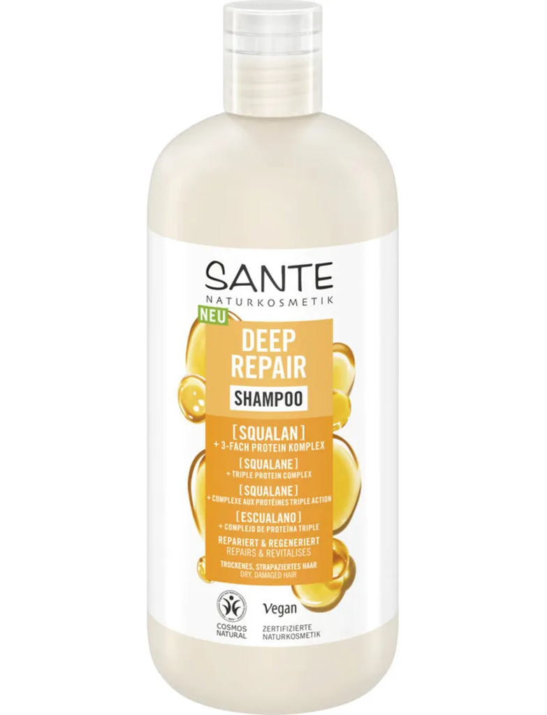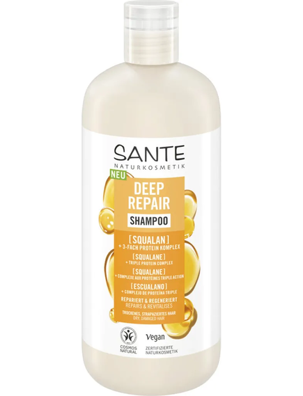 Відновлюючий шампунь SANTE NATURKOSMETIK серії Deep Repair має потужну лікувальну формулу, спеціально розроблену для сухого та пошкодженого волосся, до складу якої входить сквалан і триступеневий протеїновий комплекс. Ця формула помітно відновлює структуру волосся вже після першого використання. Сквалан склеює кератинові лусочки волосся, живить волосяні цибулини, повертаючи природне сяйво та гладкість, а також пом'якшує шкірний покрив голови. Потрійний протеїновий комплекс, проникаючи у структуру волосся у місця з втраченим білком, заповнює ці прогалини, лікуючи пошкоджені ділянки по всій довжині. Арганова олія насичує волосся вологою зсередини і запобігає її втраті, забезпечуючи захист від негативних зовнішніх факторів. Аргінін покращує кровообіг шкіри голови, чим cприяє загальному оздоровленню волосяного покриву. Оливкова олія робить волосся гладким і шовковистим, покращуючи його еластичність і міцність. Алое позитивно впливає на шкіру голови, запобігаючи появі лупи.
