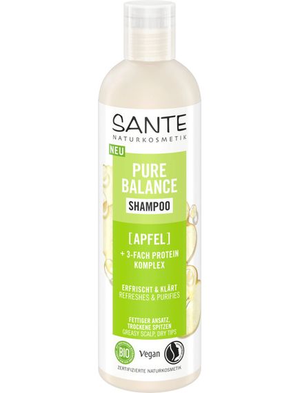Шампунь Pure Balance від SANTE NATURKOSMETIK дарує волоссю довготривале відчуття свіжості та легкості завдяки ретельно підібраному комплексу природних речовин, що глибоко очищають шкіру голови та прикореневу зону від надлишку жиру, при цьому інтенсивно зволожуючи сухі кінчики волосся. Яблучний екстракт активізує роботу волосяних фолікулів, що сприяє зменшенню випадання волосся та збільшенню його густоти. Алое у складі шампуню підтримує баланс вологи в волоссі та захищає від негативного впливу навколишнього середовища. Рослинні протеїни сої, пшениці та кукурудзи відновлюють пошкоджені ділянки сухого ламкого волосся (особливо на кінчиках), проникаючи та заповнюючи порожнечі у їх структурі.
