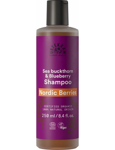 Шампунь Urtekram Nordic Berries забезпечує всім типам волосся чудове живлення та зволоження завдяки гіалуроновій кислоті, вітамінам С, Е та поживним речовинам обліпихи, чорниці, шипшини та журавлини. Екстракт кори верби підтримує баланс шкіри голови та посилює дію інших рослинних інгредієнтів. Сертифіковано Ecocert Cosmos Органічний, веганський і натурального походження.