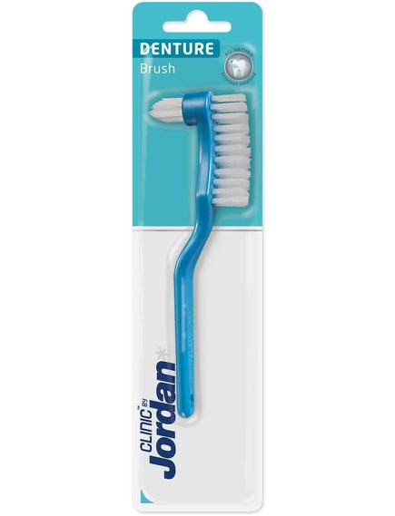Ергономічно розроблена щітка Jordan Denture має дві головки для ефективнішого очищення. Велика вигнута основна головка відповідає формі зубних протезів, забезпечуючи ефективне очищення великих поверхонь. Менша головка щітки ефективно видаляє зубний наліт і частинки у важкодоступних місцях протеза. Ретельне очищення протеза є важливим для запобігання росту бактерій, які викликають подразнення ясен і неприємний запах з рота. Міцна ручка робить щіткою зручною у використанні навіть для людей з обмеженою спритністю.
