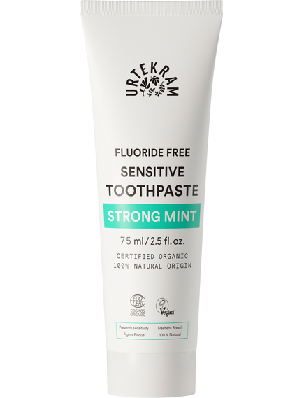 Зубна паста Urtekram Strong Mint Sensitive Toothpaste з пробіотичним екстрактом кори верби розроблена для збалансування природного захисту порожнини рота та полегшення стану чутливих зубів на додаток до природного захисту зубної пасти Urtekram. Ви можете використовувати його окремо або разом із ополіскувачем для ротової порожнини Urtekram Strong Mint Sensitive для кращого результату. Сертифіковано Ecocert Cosmos Органічний, веганський і натурального походження.