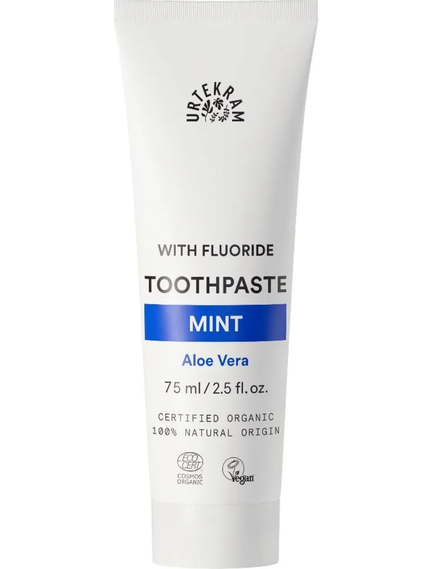 Urtekram Mint Toothpaste - це м'ятна зубна паста з фторидом і алое вера. Новий стандарт Cosmos Organic дозволяє використовувати фторид натрію. Тому ця зубна паста призначена для тих із вас, хто бажає захисту від фтору на додаток до природного захисту зубних паст Urtekram. Сертифіковано Ecocert Cosmos Органічний, веганський і натурального походження.