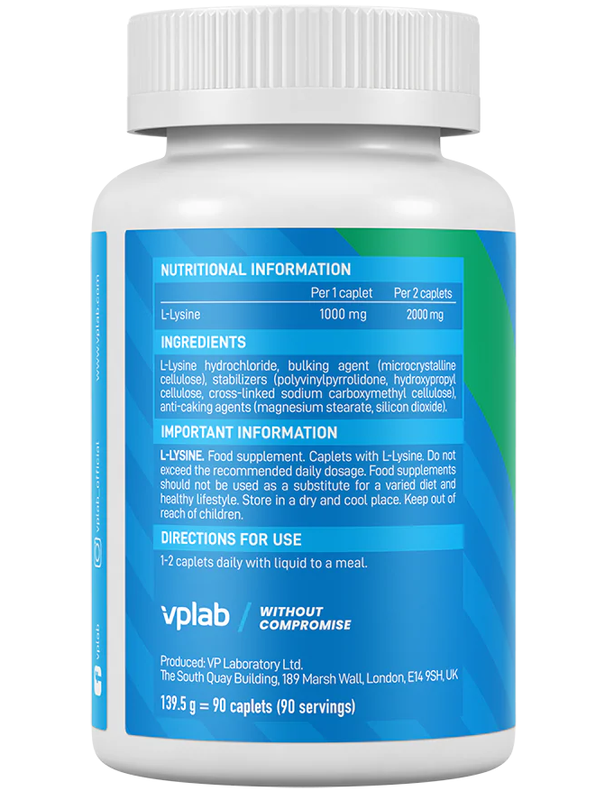 Інгредієнти: Гідрохлорид L-лізина, наповнювач (мікрокристалічна целюлоза), стабілізатори (полівінілпіролідон, гідроксипропілцелюлоза, зшита натрієва карбоксиметилцелюлоза), антистежуючі агенти (стеарат магнію, діоксид кремнію)
