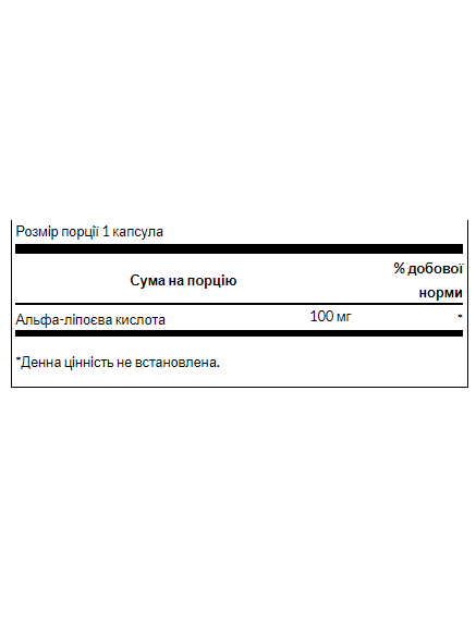 - Кількість в 1 порції: альфа-ліпоєва кислота 100 мг.