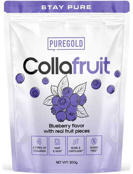 Pure Gold CollaFruit – це ароматизований гідролізований колагеновий напій у вигляді порошку з додаванням ліофілізованих шматочків чорниці, вітамінів, цинку, селену та підсолоджувачів.