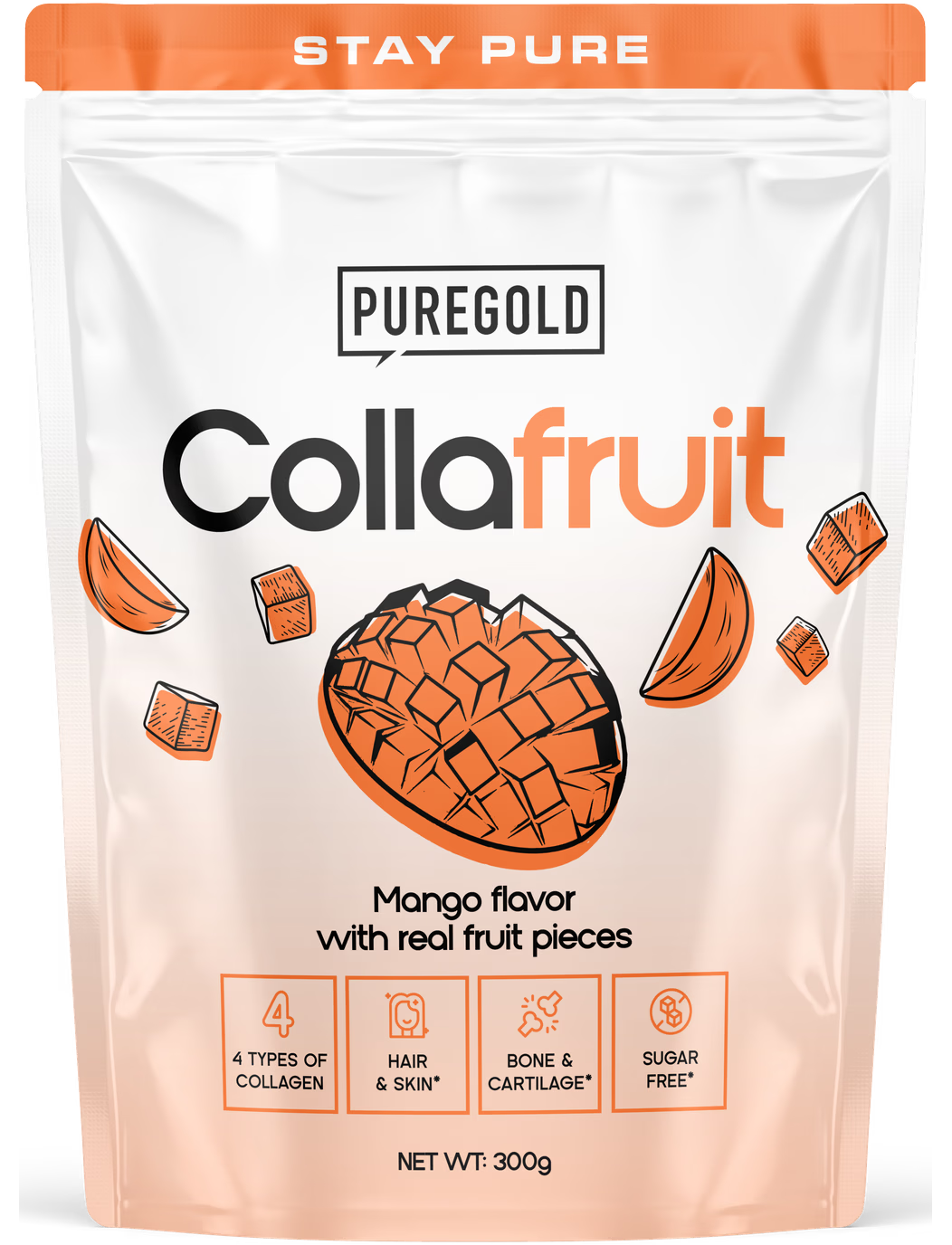 Pure Gold CollaFruit – це ароматизований гідролізований колагеновий напій у порошку з яловичого колагену з додаванням ліофілізованих шматочків манго, вітамінів, цинку, селену та підсолоджувачів.