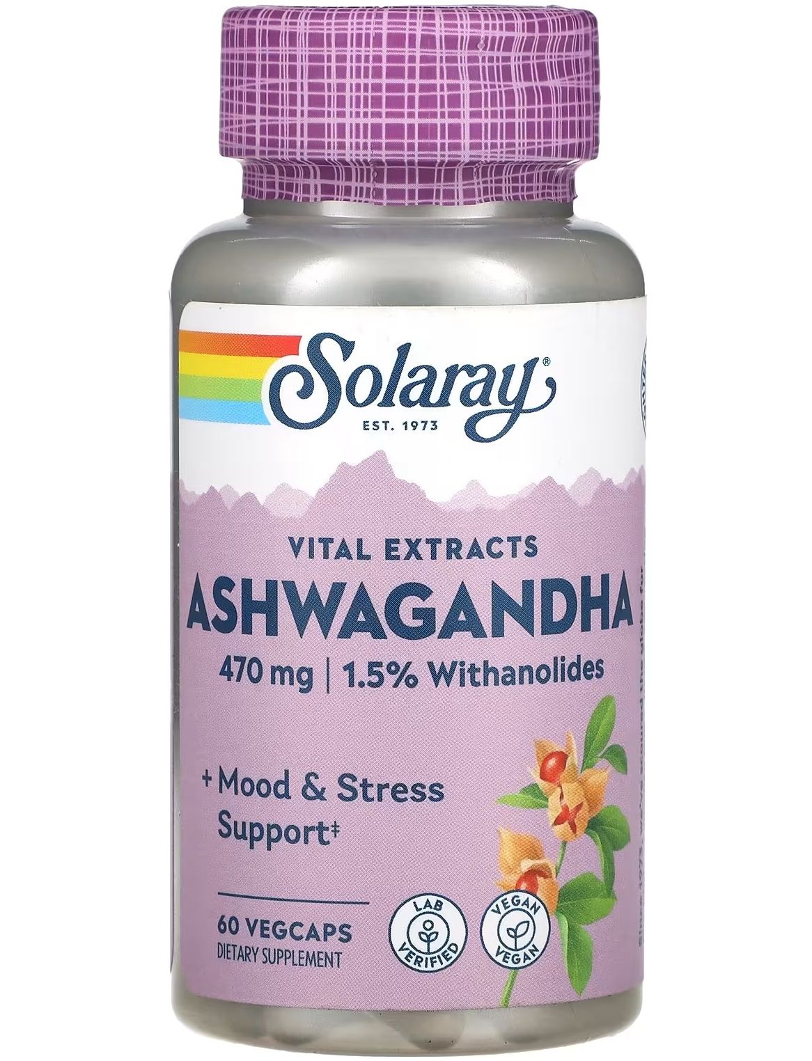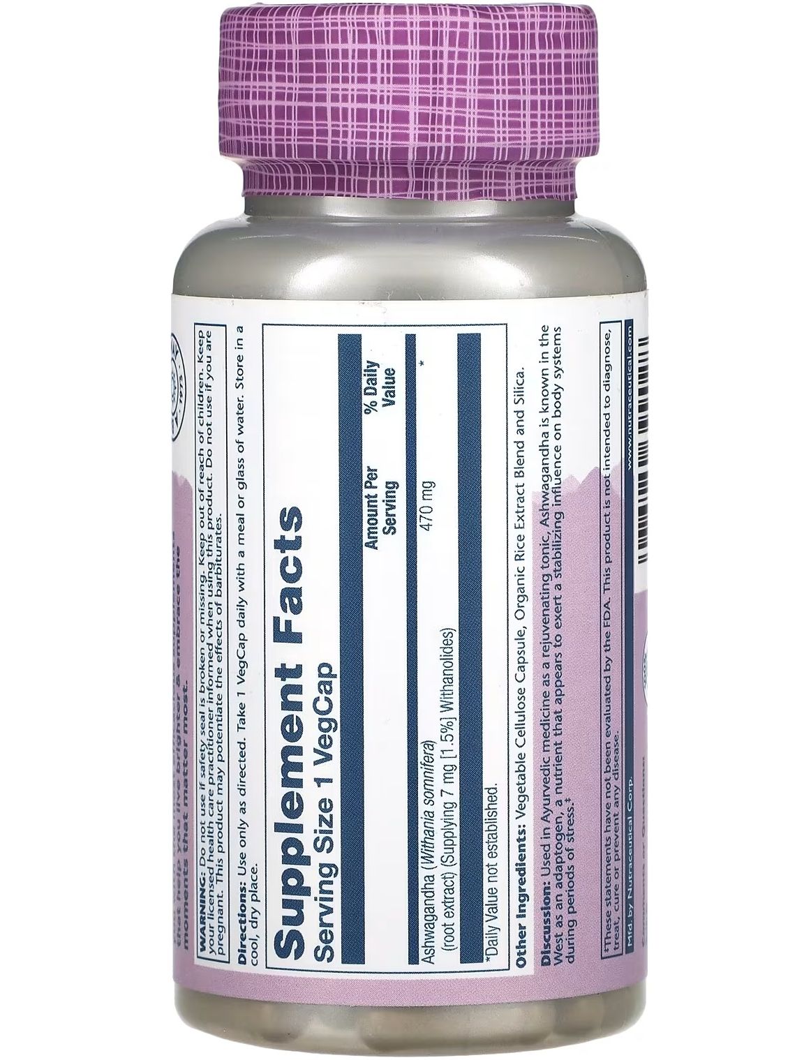 - Кількість в 1 порції: Ашваганда (Withania somnifera) (екстракт кореня) (містить 7 мг [1,5 %] вітанолідів) 470 мг.