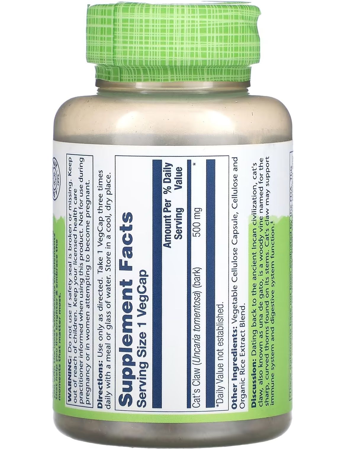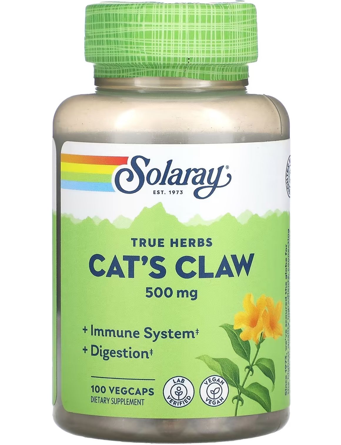 Котячий кіготь, зростаючий у тропічних лісах Амазонки, також відомий як уна де гато, являє собою деревоподібну лозу, що отримала свою назву на честь гострих вигнутих шипів на стеблах. Історія використання котячого кігтя сходить до стародавньої цивілізації інків. Для виробництва продукції Solaray використовується тільки внутрішня кора лози, що пройшла клінічні дослідження. Котячий кіготь підтримує здоровий імунітет і роботу травної системи.