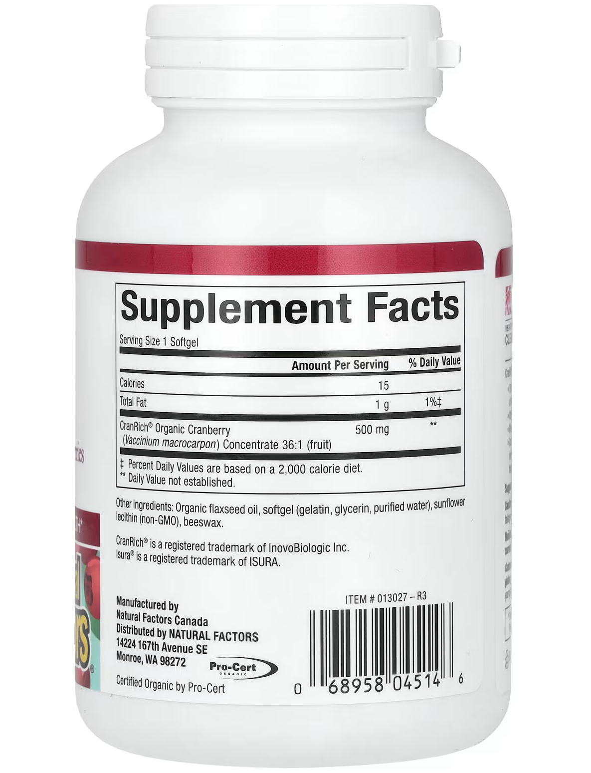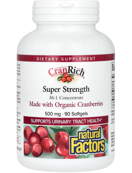 - Кількість в 1 порції: Концентрат органічної журавлини (Vaccinium macrocarpon) 36:1 (плоди) CranRich® 500 мг