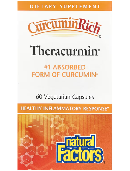 Куркумін — це жовтий пігмент куркуми, який має багато цінних переваг для здоров’я, але важко засвоюється організмом. Theracurmin — це натуральний препарат куркуміну, у якому використовуються передові методи зменшення розміру частинок куркуміну, що різко підвищує його розчинність і біодоступність. Докладні дослідження засвоюваності довели, що Theracurmin є найкраще засвоюваною формою куркуміну на ринку‡.
