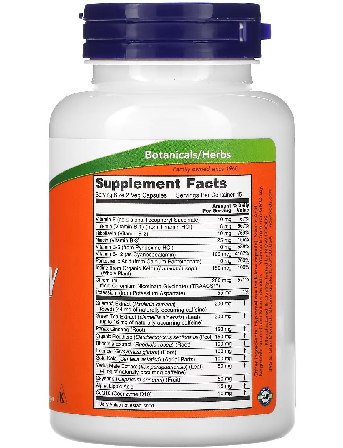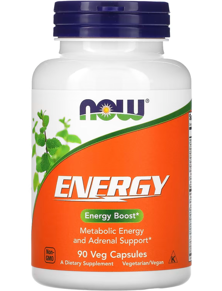 Енергетична добавка NOW® Energy містить комплексний набір поживних речовин і харчових інгредієнтів, що наповнять організм енергією. До складу цього продукту входять такі інгредієнти як вітаміни групи В, зелений чай, женьшень (Panax ginseng) і родіола, що сприяють термогенезу, виробленню енергії та роботі надниркової залози. Кофеїн, що міститься в цій добавці, має природне походження та є складовою рослинних інгредієнтів, як-от гуарани, мате та зеленого чаю.