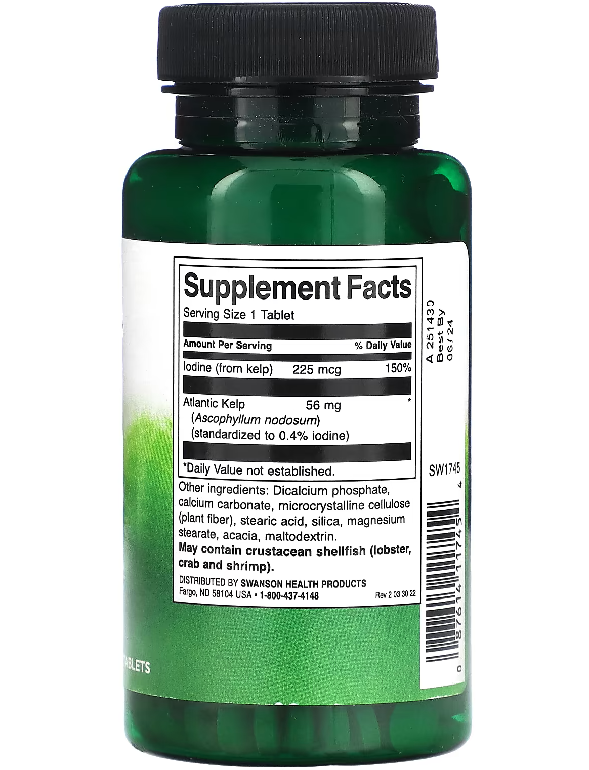 Бурі водорості Swanson — це унікальна формула, яка допомагає підтримувати здоров’я щитовидної залози. Ця океанічна рослина насичена поживними речовинами та є багатим джерелом йоду, необхідного мікроелемента, який сприяє здоровій роботі щитовидної залози. Кожна таблетка бурих водоростей містить 225 мкг йоду.