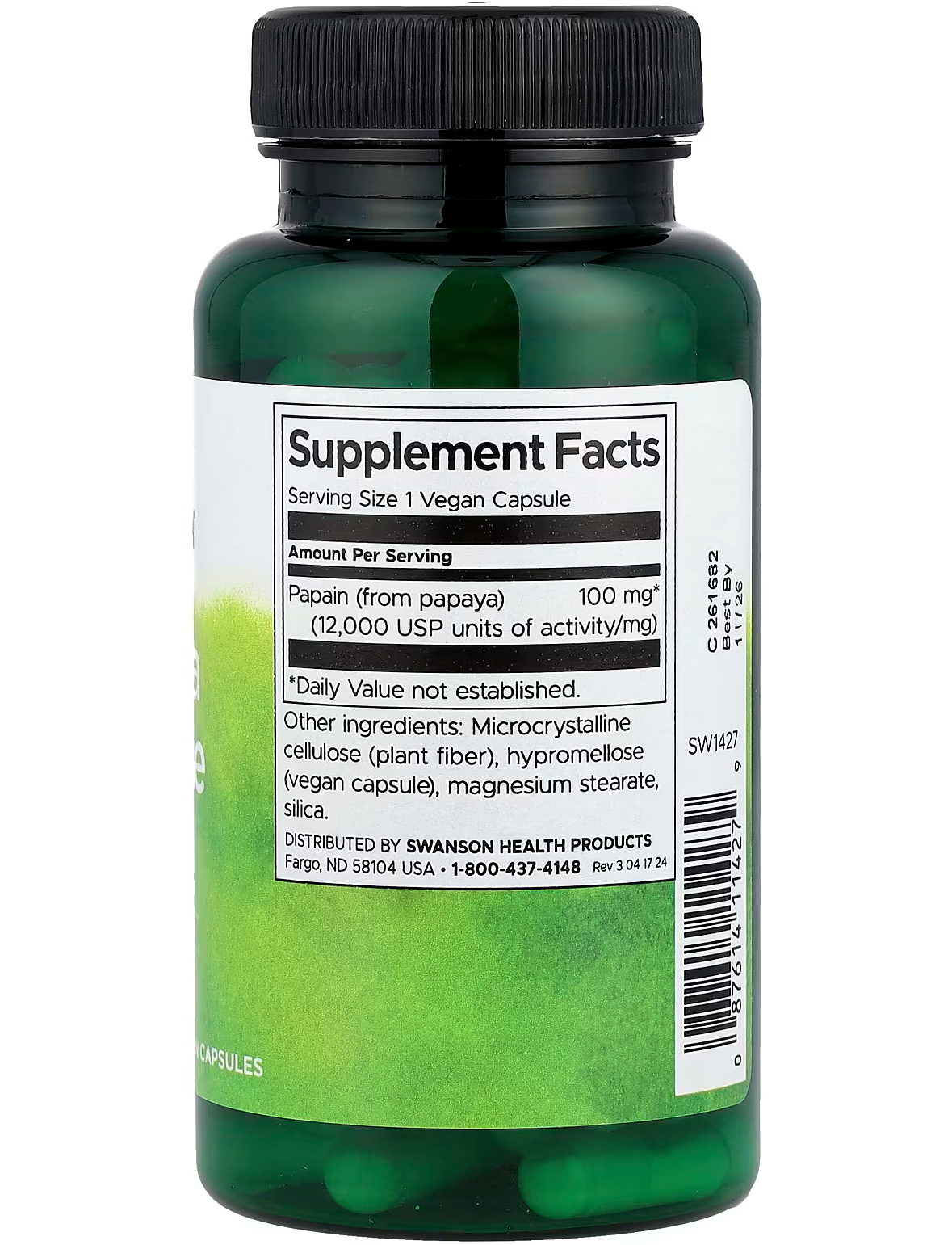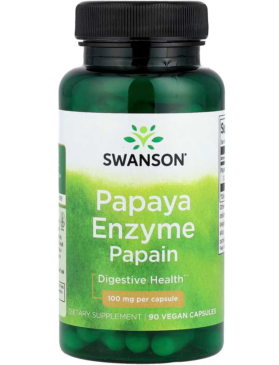 Папаїн, відомий фермент для перетравлення білків, що міститься в папаї, часто випускається у формі жувальних таблеток, які зазвичай містять небажаний цукор і калорії. Папаїн, фермент папаї від Swanson у вегетаріанських капсулах, доставляє чистий фермент прямо до шлунка, де він може виконувати свої функції. Ці капсули не містять цукру, штучних барвників або непотрібних добавок, а лише чистий папаїн, який перетравлює білки.