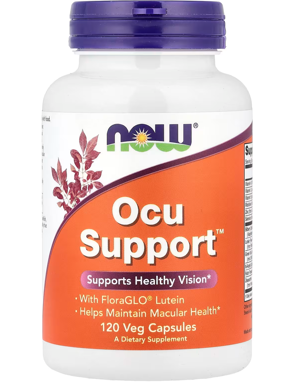 Добавка Ocu Support™ від NOW® містить повний спектр антиоксидантних поживних речовин, які можуть підтримувати деякі ключові функції зору. Одна щоденна порція Ocu Support™ містить 10 мг лютеїну — каротиноїду, який міститься в темно-зелених листових овочах. Лютеїн є основним пігментом у макулярній області ока. Крім того, до складу входять антиоксидантні вітаміни A, C і E, а також поживні речовини, необхідні для нейтралізації вільних радикалів, що утворюються під дією сонячного світла. Крім того, екстракт чорниці містить біологічно активні флавоноїди, які підтримують здоровий зір.
