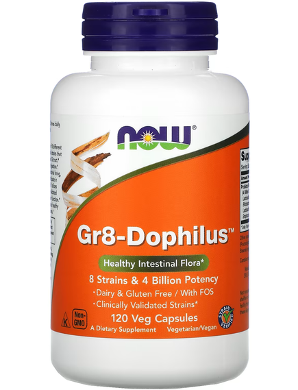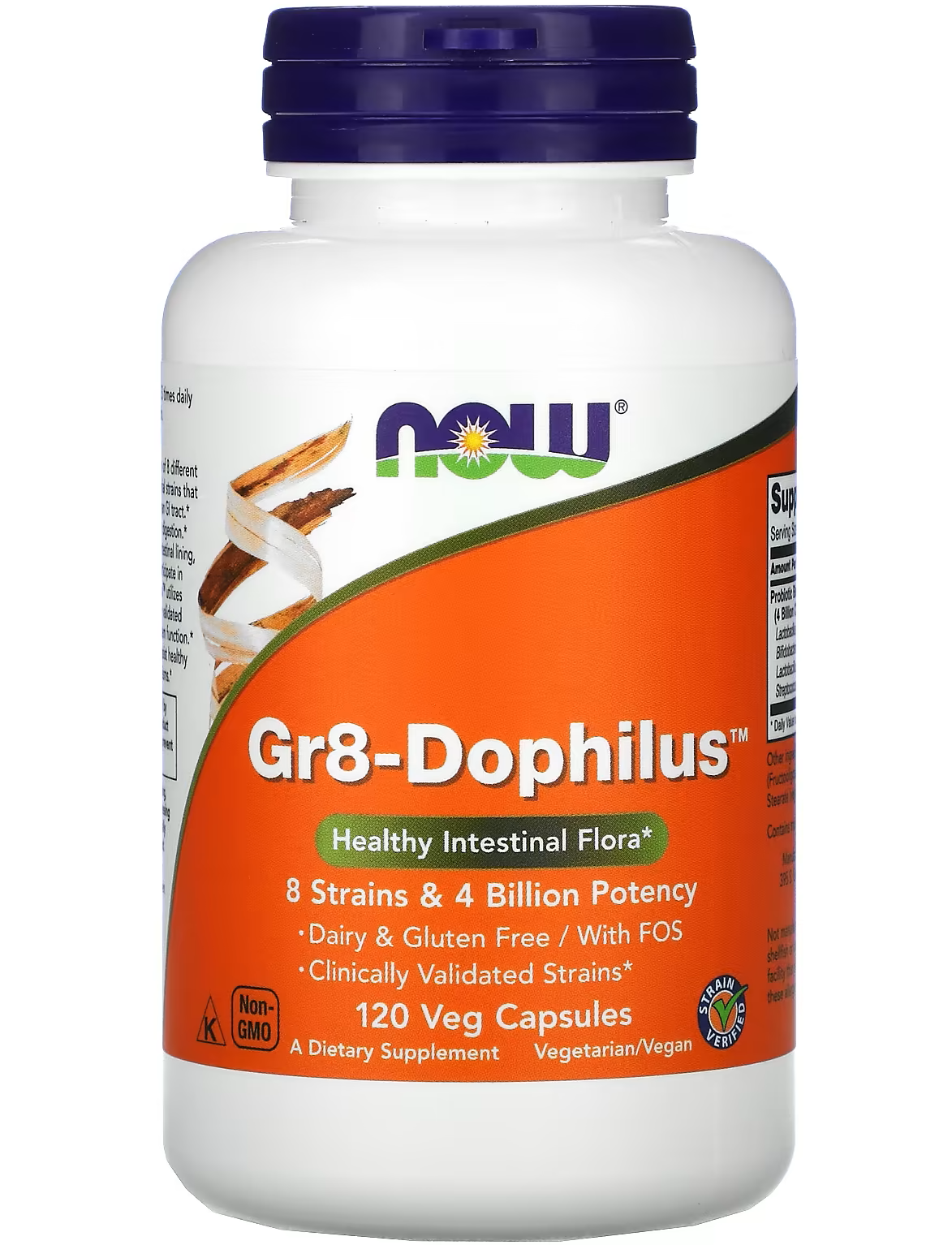 Gr8-Dophilus™ від NOW® — це комбінація 8 різних видів кислотостійких пробіотичних штамів бактерій, які, як відомо, природним чином колонізують шлунково-кишковий тракт людини. Пробіотичні бактерії мають вирішальне значення для здорового травлення. Вони допомагають підтримувати цілісність слизової оболонки кишечника, підтримують нормальну перистальтику кишечника та беруть участь у процесі детоксикації. Gr8-Dophilus™ містить штами бактерій, які були клінічно підтверджені для підтримки нормальної роботи імунної системи. Крім того, до складу цього продукту входить ФОС, що сприяє здоровому росту ацидофільних і біфідобивних мікроорганізмів.